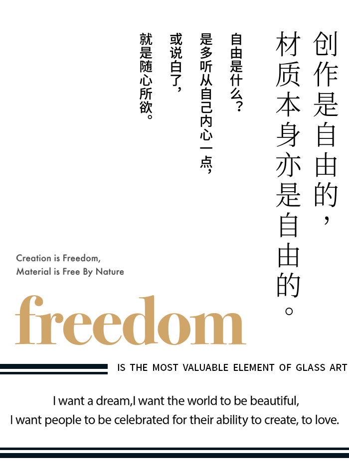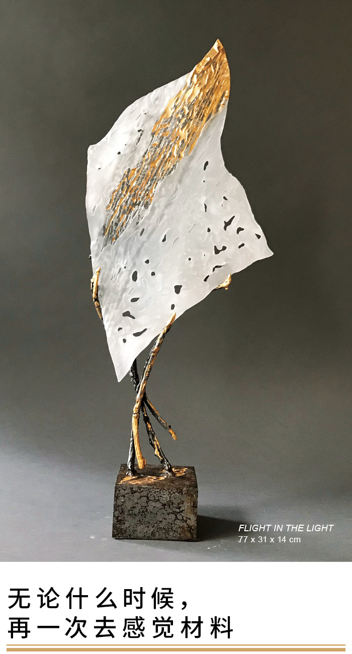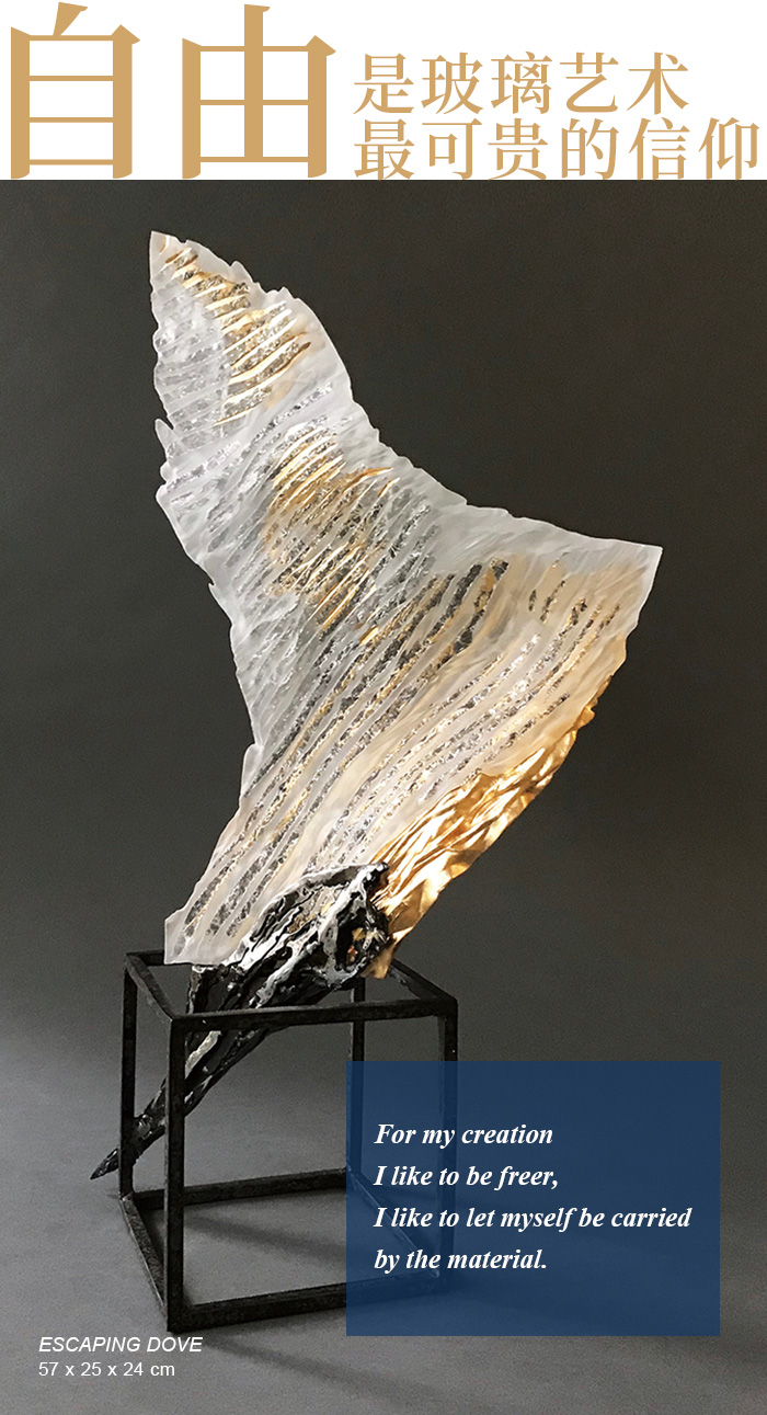 忠于内心,诚实面对,用自我的语言,吶喊生命与灵魂。摒弃斒斓,抽离浮世,回归最本质的颜色—光明的金,纯粹的透,土地的黝黑;轻盈、美丽、坚韧。极简的色彩,恣意的造型,玻璃与金属的结合,恍如自然生长;人物,自然,动态与精神世界,以最纯粹的面貌,无所拘束,演绎自由。这份对玻璃的情愫,时刻展现优雅,随性且独立进取的动人魅力。自由,是玻璃艺术最可贵的信仰,是邦特内心,不容侵犯的神圣之所。