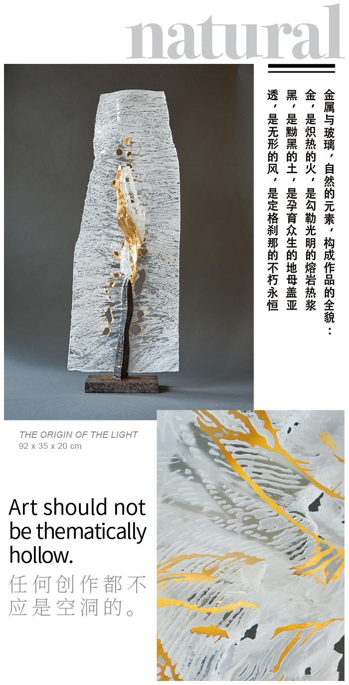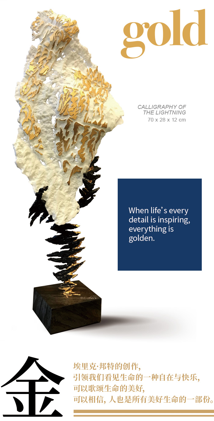 金,一直被视为神圣与永恒的象征。它源自地球的核心,是天地的馈赠,是神的礼物。炼金术师的传说里,金被誉为「最高尚的金属」,它拥有生命力,是克服一切罡碍的灵药。邦特眼中的金,剥除那层迷幻主义,他认为,金与玻璃一样,与光的那种令人心驰神往的互动,随着视角不同而拥有极大的变幻。邦特的金,是发现与进步的隐喻。