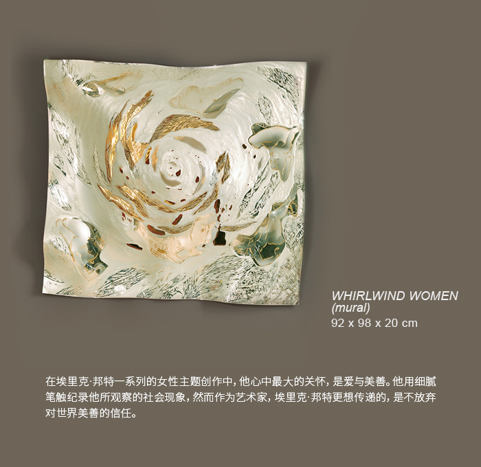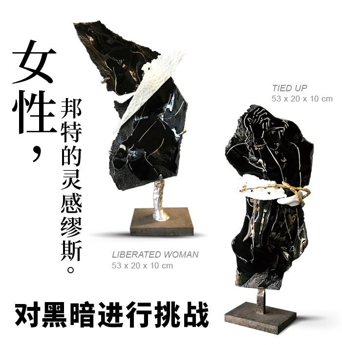 TIED UP 与 LIBERATED WOMAN一反埃里克·邦特玫瑰窗绚丽夺目的印象,他以沉默的黑,高冷的金,寂静的白,进行女性主题的创作,大胆犀利的风格,令人惊艳。因为必须知道,埃里克·邦特的出生地法国,一直是西方女性艺术的创作重镇,尤其自印象派以来,雷诺阿以女性主题进行的创作,白皙温润的肌肤,带了点粉彩的光和色泽,以及明亮愉悦的服饰色彩,直至近代,仍是描绘女性艺术的主流的风格。但是,邦特打破了这项潜规则,TIED UP 看不见一丝的愉悦,沉默的黑色,夺走了她的发言权,手捂着耳朵,像是听多了这世界对她的嘲讽,高冷的金,捆住了她的身躯,生活,是否将灵魂捆绑了?然而有趣的是,同一创作系列的LIBERATED WOMAN,没有了高冷的金的束缚,身体却更加的扭曲,甚至模糊了脸的表情,这里不禁要反问的是,少了枷锁,灵魂就真的解放了吗?
