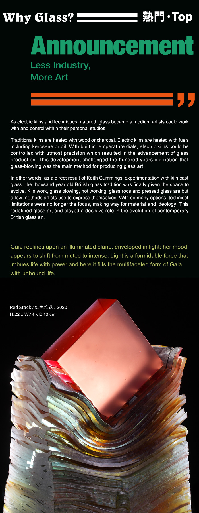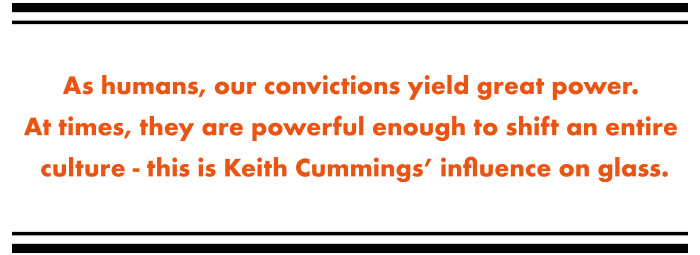 In other words, as a direct result of Keith Cummings’ experimentation with kiln cast glass, the thousand year old British glass tradition was finally given the space to evolve. Kiln work, glass blowing, hot working, glass rods and pressed glass are but a few methods artists use to express themselves. With so many options, technical limitations were no longer the focus, making way for material and ideology. This redefined glass art and played a decisive role in the evolution of contemporary British glass art.