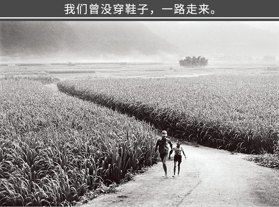 远方的山,雾气微朦,一对小兄弟,赤脚奔跑在田间小路上。