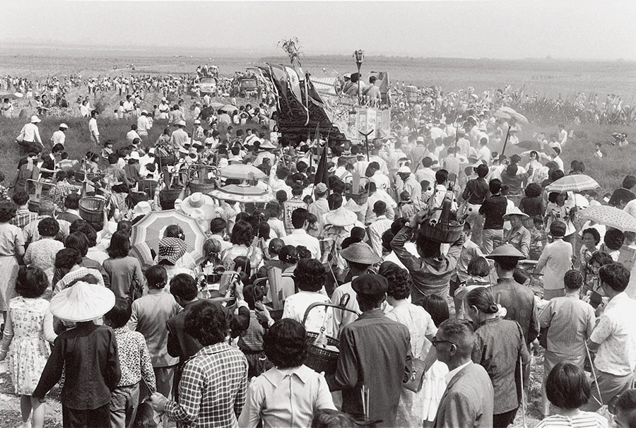 他们的服装,,包括左下角的蓝布衫,斗笠,女孩穿的洋装,右边那个妈妈头的包头……都是一个集体回忆。这么辽阔的空间,这么多的人往前,要把王船送往海上的感觉,是一个大的信仰的力量,如今,这个场景跟时空都没有了,这是阮义忠留下这个影像的最单纯的价值。